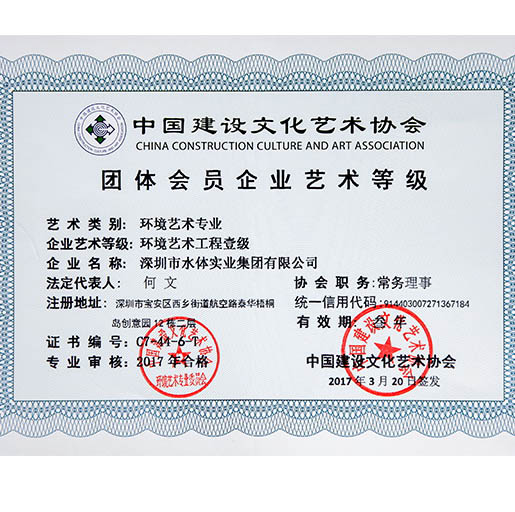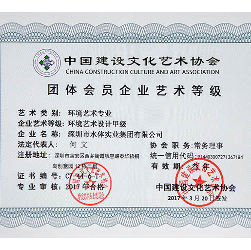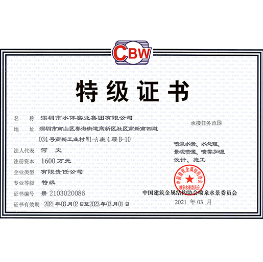水體集團(tuán)是噴泉界的先驅(qū),是中國(guó)華南地區(qū)具實(shí)力的噴泉水景專(zhuān)業(yè)公司,是中國(guó)噴泉水景委員會(huì)副主任單位、中國(guó)環(huán)境藝術(shù)委員會(huì)常務(wù)理事單位、深圳市《政務(wù)、商務(wù)決策專(zhuān)家咨詢支持系統(tǒng)》定點(diǎn)服務(wù)單位,具備噴泉水景、水處理、景觀噴灌、噴霧加濕、設(shè)計(jì)、施工專(zhuān)業(yè)等級(jí),環(huán)境藝術(shù)企業(yè)藝術(shù)等級(jí)總承包類(lèi)、工程類(lèi)一級(jí)、設(shè)計(jì)類(lèi)甲級(jí),城市及道路照明工程專(zhuān)業(yè)承包三級(jí),等等資質(zhì)。