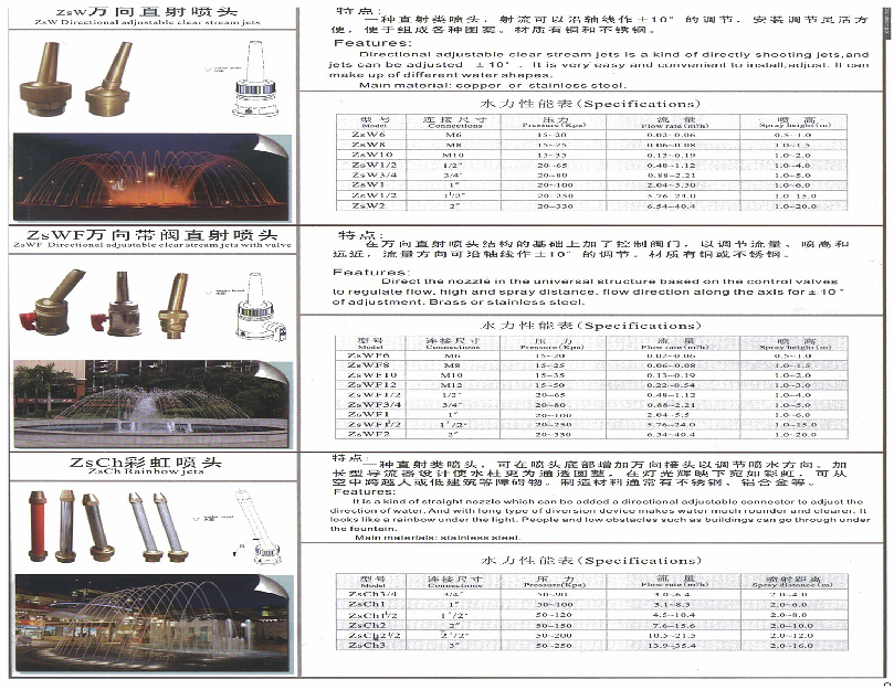 由我公司特殊研制的主噴噴頭等選用不銹鋼制作;噴頭的設(shè)計(jì)是在參照國(guó)外公司噴頭技術(shù)的基礎(chǔ)上,在完善的設(shè)計(jì)理論和設(shè)計(jì)依據(jù)指導(dǎo)下,結(jié)合豐富的實(shí)踐經(jīng)驗(yàn)設(shè)計(jì)制作出工藝精細(xì)考究,造型精巧美觀,結(jié)構(gòu)獨(dú)特合理的噴頭,使得噴頭射流平滑穩(wěn)定,噴高相同,所需泵的功率小,節(jié)省能耗約30%;使用壽命長(zhǎng),是普通噴頭的2倍,防止噴頭的堵塞,在水泵進(jìn)水口處設(shè)置了專用的噴泉泵過濾裝置,使得噴頭更加經(jīng)久耐用;滿足CJ/T3050相關(guān)標(biāo)準(zhǔn)。